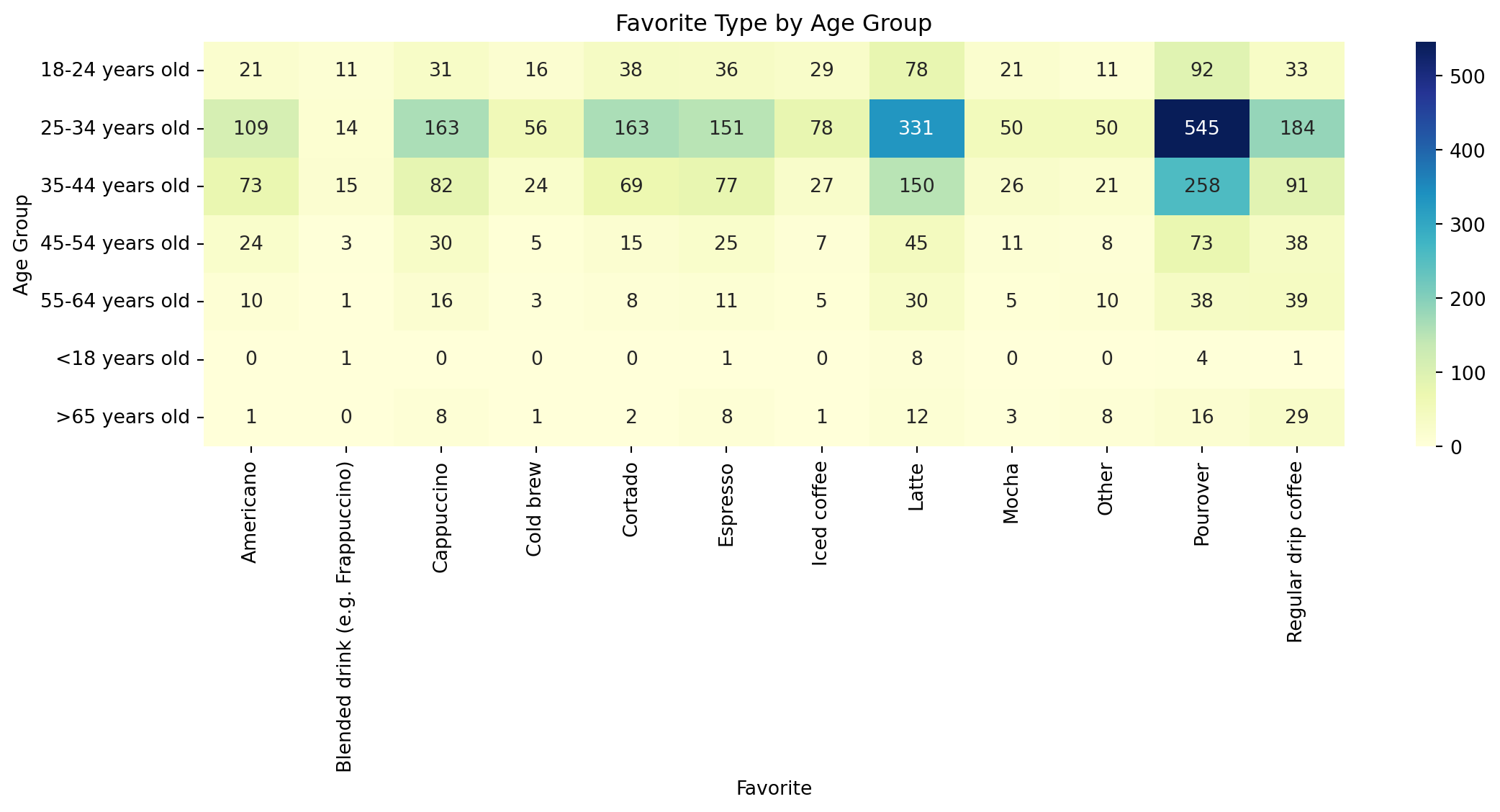 * Focusing on 4 attributes including age, where to drink, favourite, and style of drinking coffee.