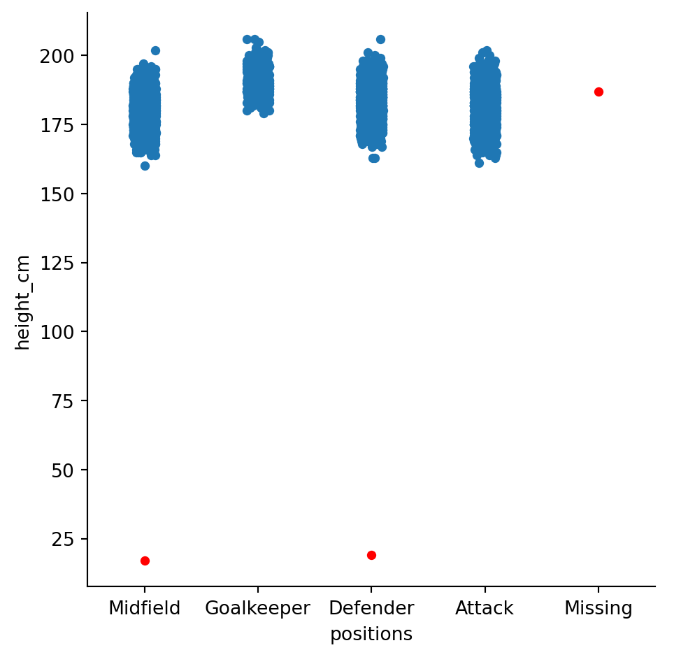 It looks like some of the players’ positions and heights were recorded incorrectly. To clean, let’s remove the “Missing” positions and ensure that heights are reasonable:
